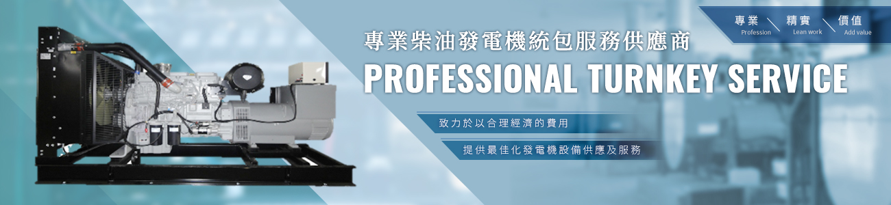 由一群具專業機電設備設計、製造、安裝及整合等多年經驗的專業人員組成的團隊,秉持著「專業。精實。價值」的理念,提供柴油引擎發電機系統設計、安裝、施工及統包服務,致力於以合理經濟的費用提供最佳化發電機設備供應及維修保養服務。銷售各種環保引擎的柴油引擎發電機組,適用於科技工廠、高級住宅、IDC機房及醫院、百貨公司、五星級酒店及政府辦公大樓等。